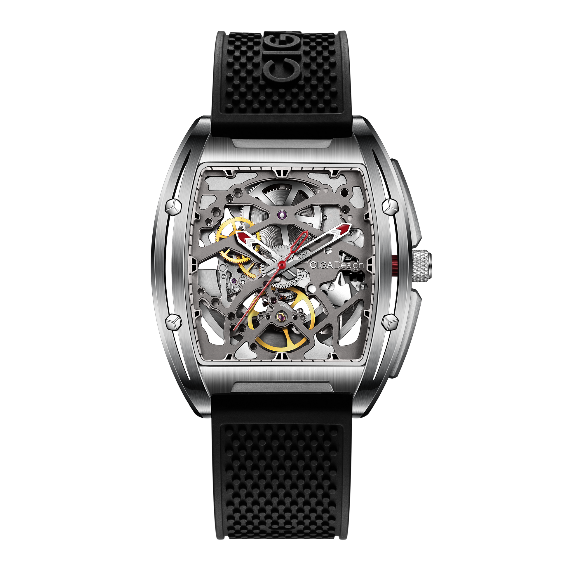 The curved case fits naturally on the wrist—uniting bold structure with everyday comfort.